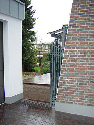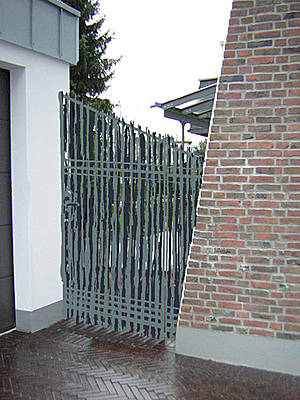 Diese aus vorgefertigten Profilen, Winkeleisen und Flacheisen, gestaltete Gittertür schützt vor neugierigen Blicken.