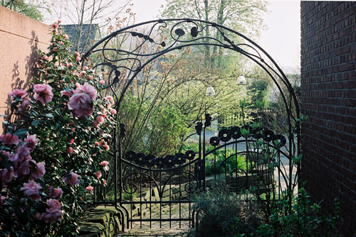 In den geschmiedeten Toren werden historische Elemente und Schmiedetechniken aufgenommen und mit modernen Formen der Metallgestaltung in einen neuen Zusammenhang gestellt.